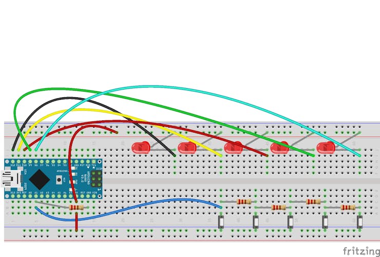 - Connect the negative terminal of each LEDs to the digital pin D12 to D8 of Arduino, respectively.